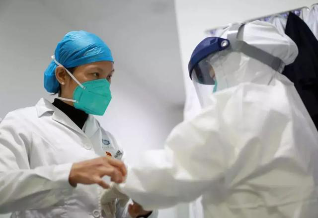 李颖(左一)在为同事整理防护服