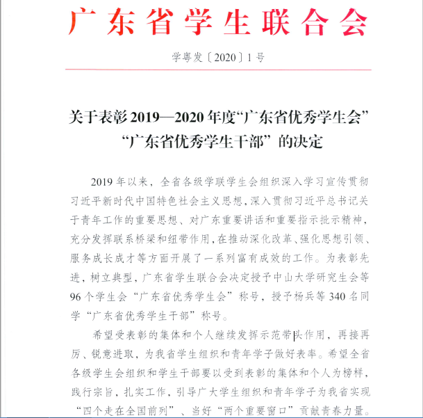 2020年4月,在广东省学生联合会主办的2019-2020年度“广东省优秀学生会”、“广东省优秀学生干部”评选活动中,304永利研究生会获得了2019-2020年度“广东省优秀学生会”荣誉称号。