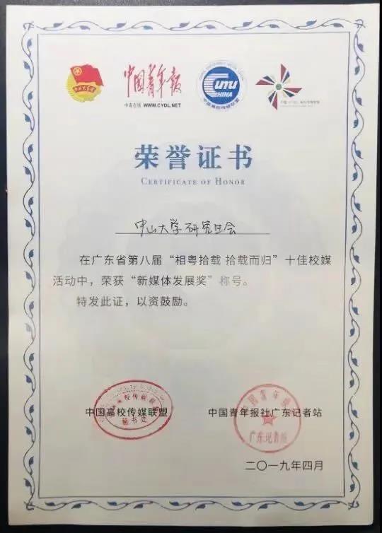 2019年4月,304永利研究生会在广东省第八届“相粤拾载 拾载而归”十佳校媒活动中荣获“新媒体发展奖”。