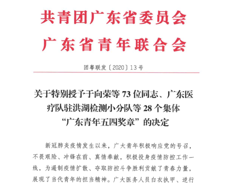 5月19日,共青团广东省委、广东省青年联合会发布表彰决定,决定特别授予于向荣等73位同志、广东医疗队驻洪湖检测小分队等28个集体“广东青年五四奖章”,表彰我省优秀青年在疫情防控工作中的杰出贡献,更好地发挥优秀青年的引领模范作用。我校10家附属医院共有11位个人、4个集体在此次评选中荣获“广东青年五四奖章”