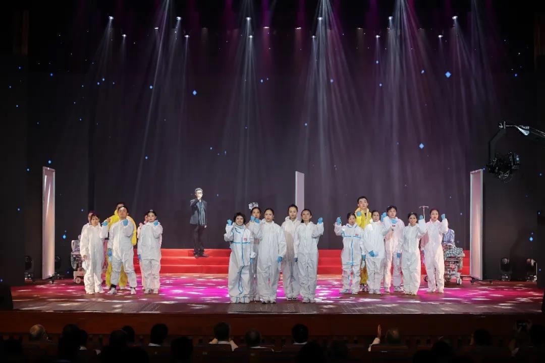 ▲附属第六医院艺术团、援鄂医疗队全体队员表演音乐情景剧《医者》(来源:党委宣传部)