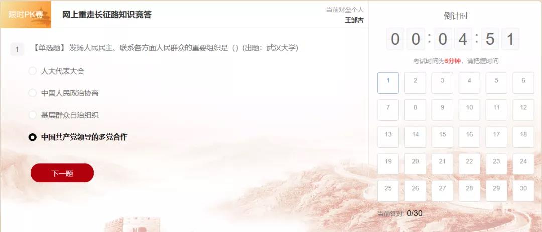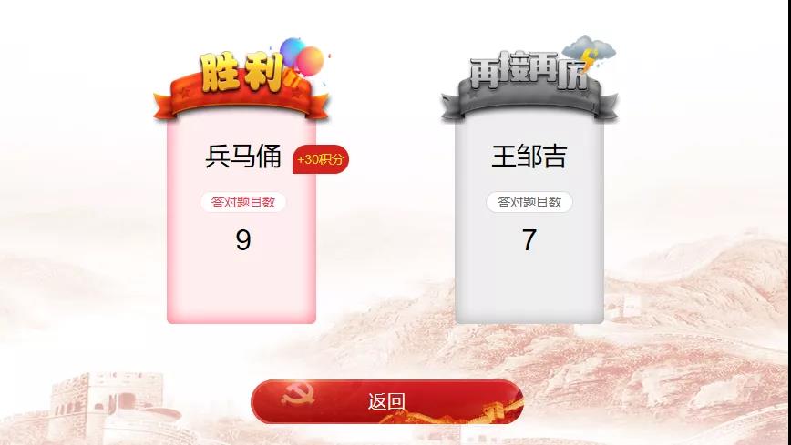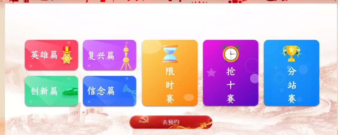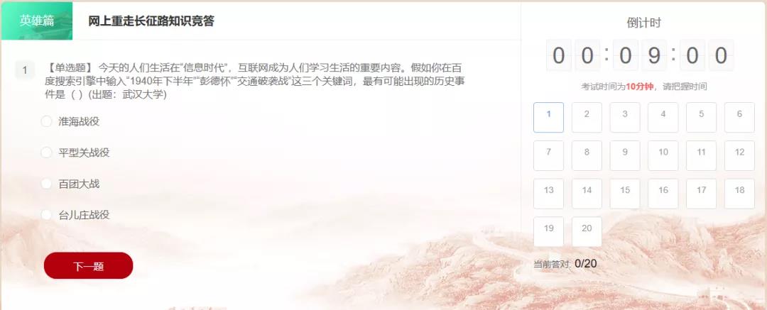 (1)每日答题:选择英雄篇、复兴篇、创新篇、信念篇答题,系统按内容随机出20道题,限时10分钟,每题1分,根据选手答对的题数进行积分,分数计入个人积分。