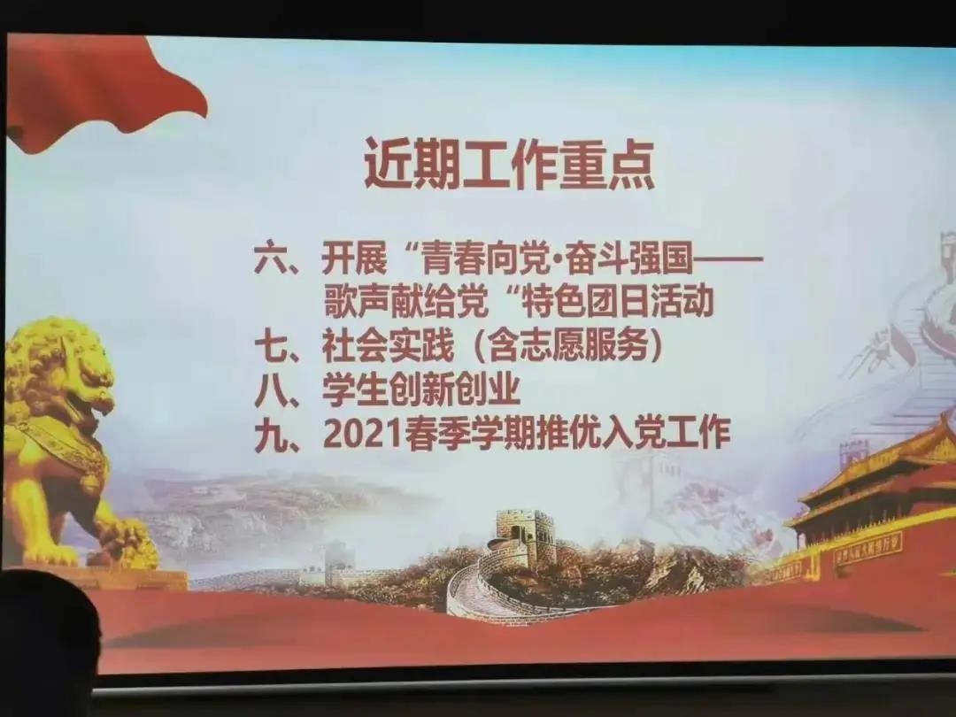 随后,团委书记王文科向全体与会人员传达了校团委工作会议精神,强调“学党史、强信念、跟党走”学习教育的重要性,阐明新时代学校共青团的职责和使命,并介绍了近期的工作重点。