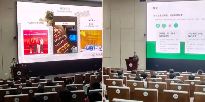 随后,两位优秀的中大志愿者接力分享,为学子们搭建起高中与大学的沟通桥梁。第一位中大学姐以“我的大学生活”为题,从课堂学习、社团活动、科研实践等方面,生动讲述了自己在中大的成长轨迹。中大不仅有严谨的学术氛围,更有丰富的成长平台,在这里,每个人都能找到属于自己的发光点。第二位中大学姐聚焦“高中理科学习经验”,结合自身高考经历,毫无保留地分享了高中学习经验。同学们积极互动,主动请教自己在学习中遇到的困惑,志愿者耐心解答。这场分享不仅为同学们提供了科学的学习方法,更传递了“坚持到底、全力以赴”的奋斗信念。